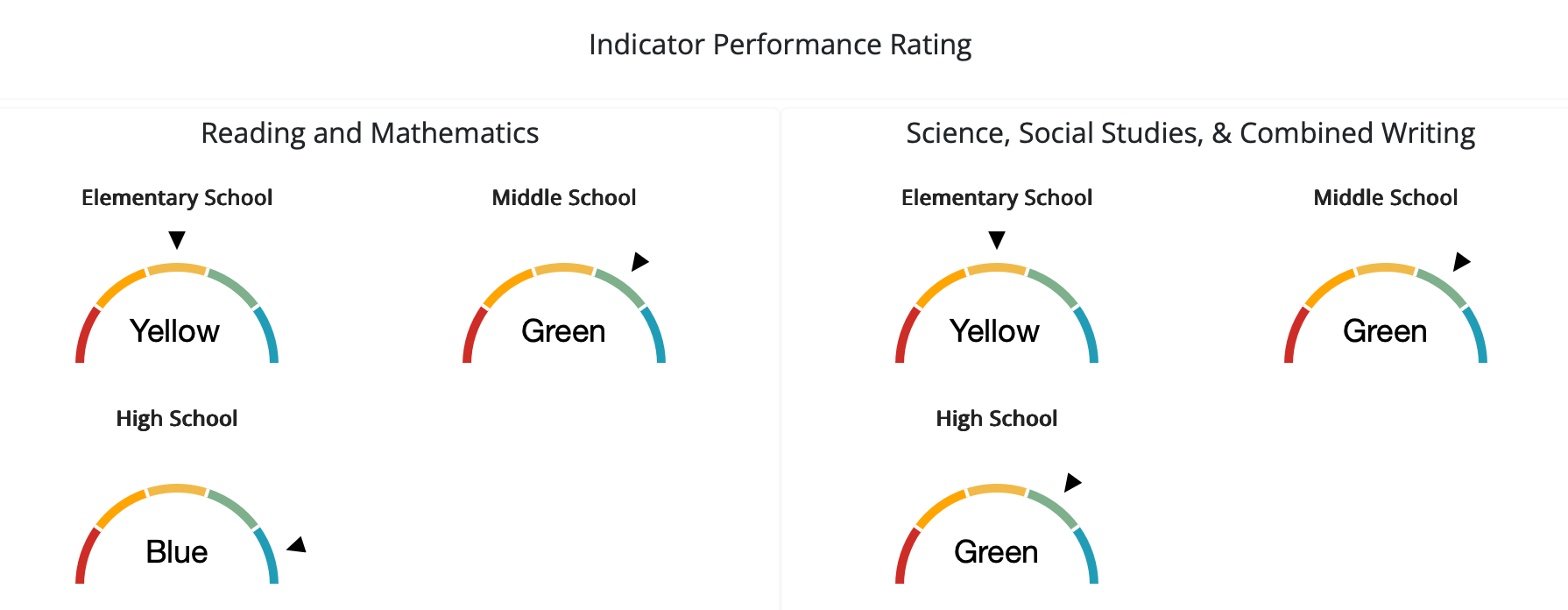 The overall evaluation for school accountability this year for Community Middle School held steady from last year at yellow. Similarly, the middle school kept in the green zone for science, social studies and writing. Safety and climate scores for the middle school slipped from blue to green over the years, however.