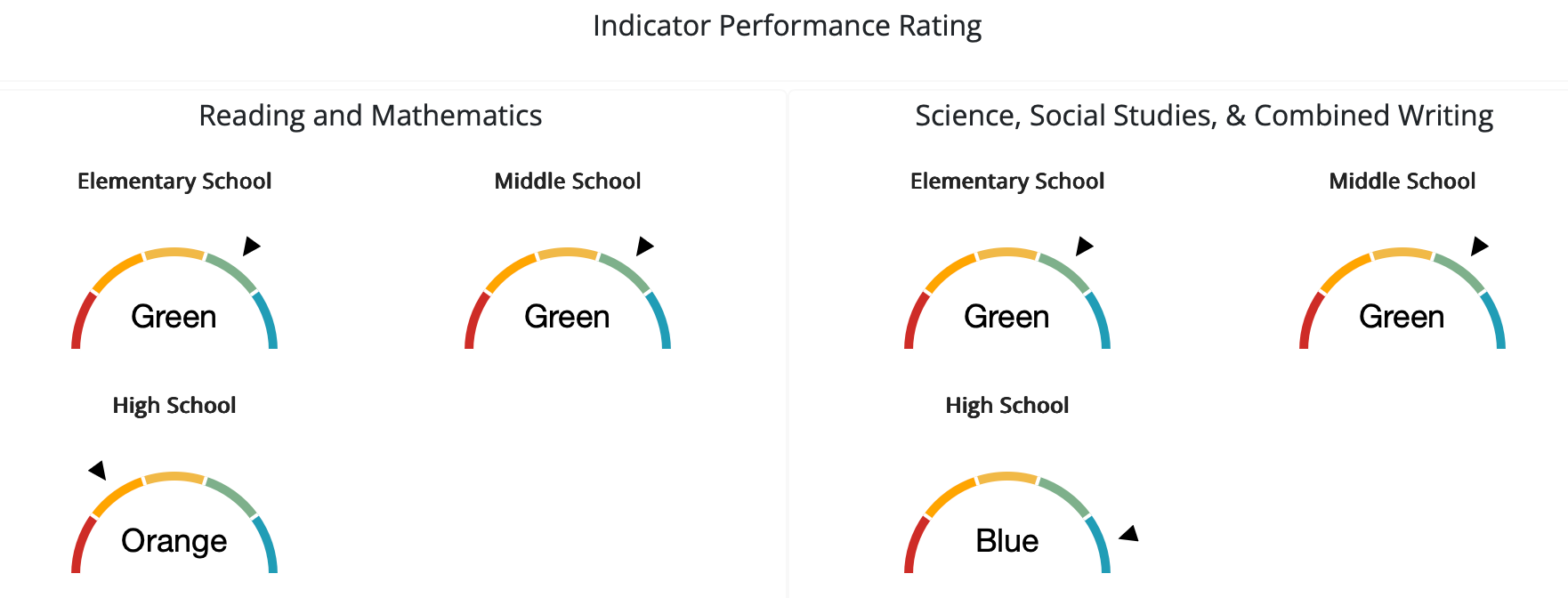 Schools in the state are ranked across a number of indicators according to a color scale. Red is the worst while blue is the best. After red comes orange, then yellow, then green. A school's accountability rating is determined by the combined rankings earned by the school across multiple categories, including math, reading, and where high schools are concerned, post-secondary readiness.