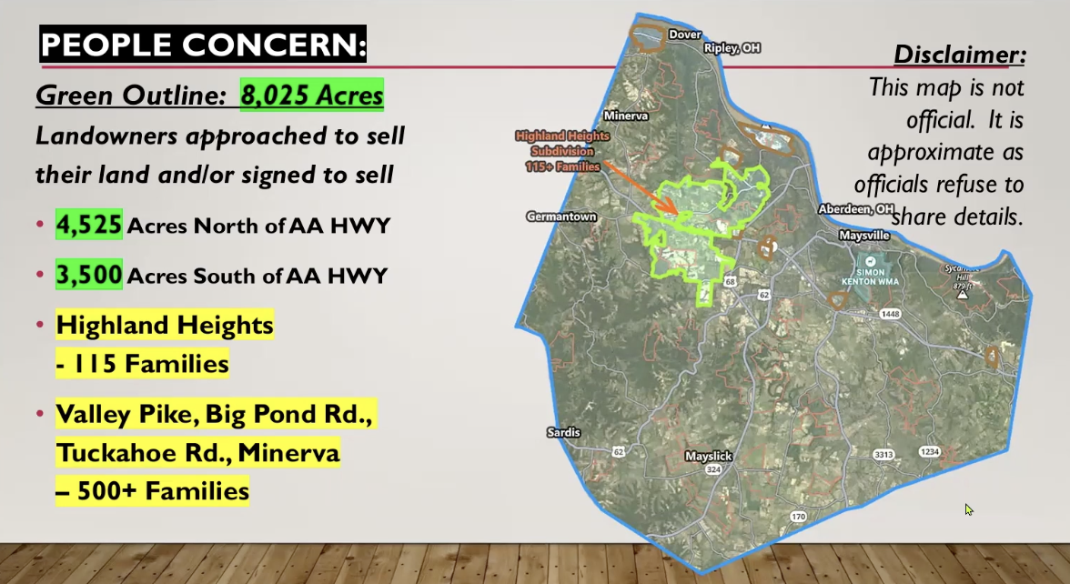 The nonprofit, said Moran, got started, "From just people talking about how they'd been approached about their land, then being told to sign an NDA. It made them suspicious," Moran said in the interview, noting that farmers in the Ohio River border county have fielded inquiries from the developer on over 8,000 acres of productive farm land.
