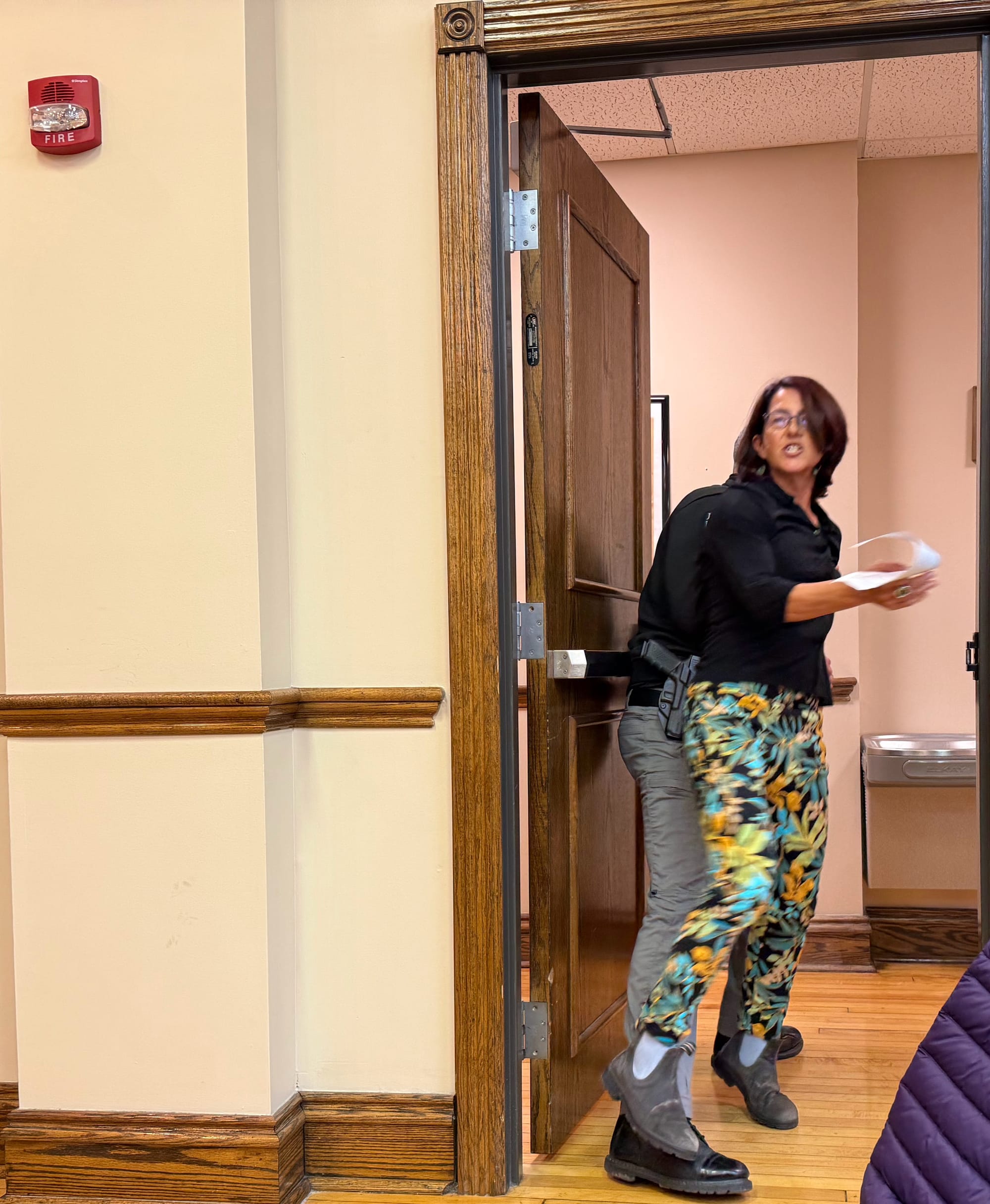 "I was trying to tell her several times that I didn't want to take her to jail and for her to listen to the mayor, and to just please come with me," Hays told The Edge after the meeting. "She kept talking and talking, and talking over me and talking over Bruce, and then he was trying to talk over her. So, I'm not sure how much she heard me. Then the mayor looked at me and he's signaling for me to take her out of the room, so I began to pull her out of the room," Hays said.