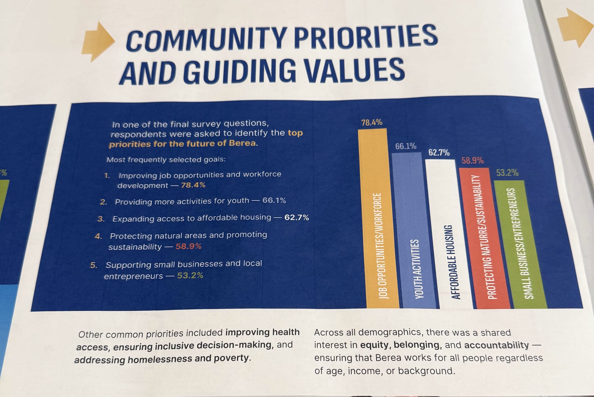 Rounding out the top five priorities were protecting Berea's natural areas and promoting sustainability, and supporting small businesses and local entrepreneurs.