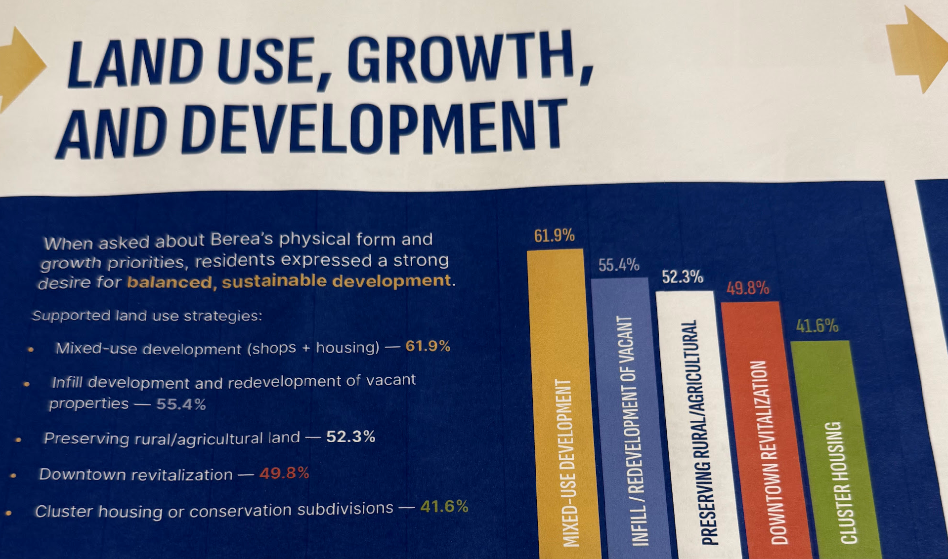 Further, Bereans expressed "a strong desire for balanced, sustainable development" according to the data presentation. While a need for industrial parks did not rank anywhere in the list, about two-thirds (61.9%) of respondents placed an emphasis on mixed-use projects. These could include multi-story buildings with storefronts on the ground floor, and living units above, according to Martin Richards, Berea's Planning and Zoning vice chair.