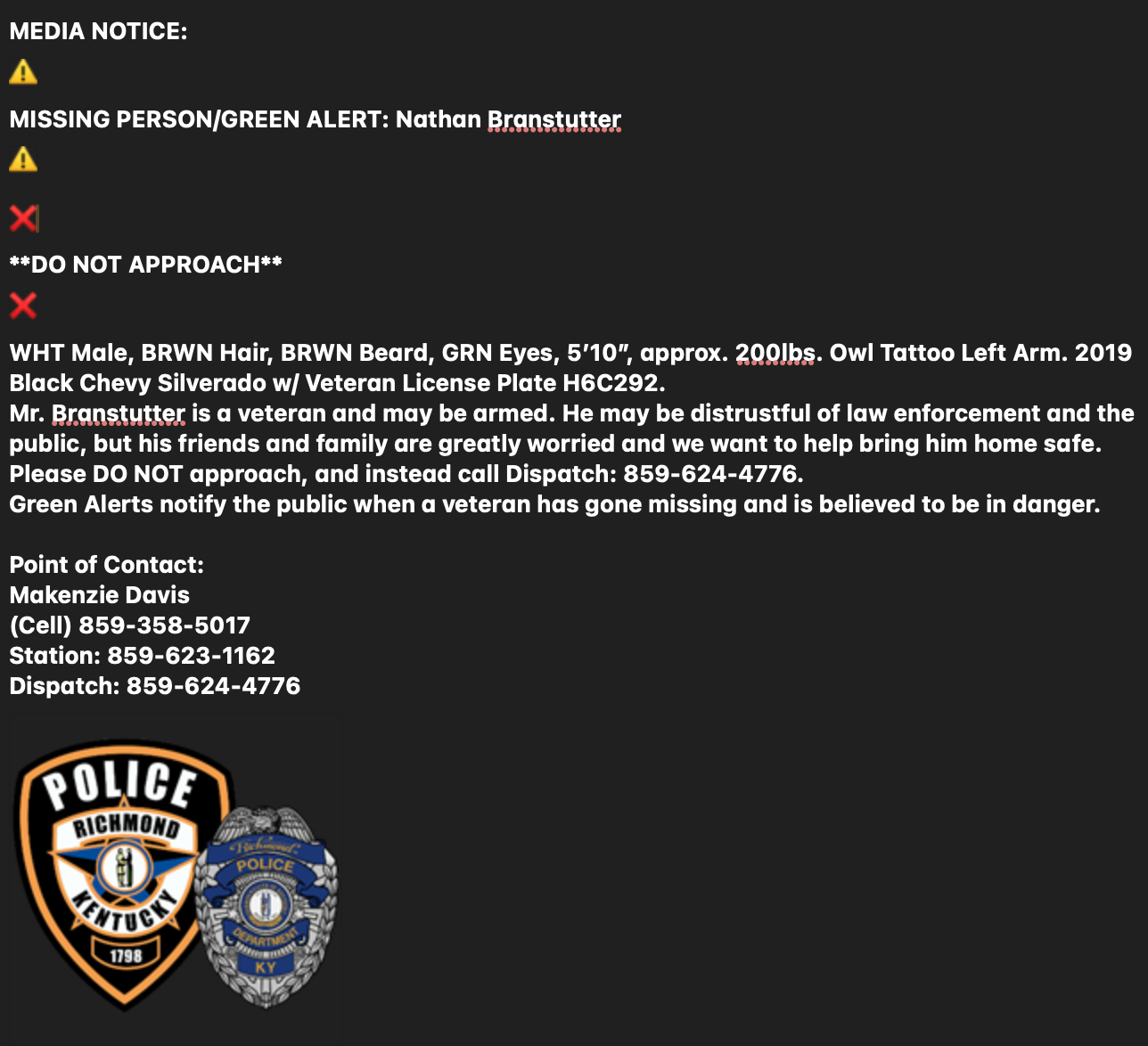 By Whitney McKnight on Feb 2, 2026 Notice from Richmond Police Green Alert for Nathan Branstutter News