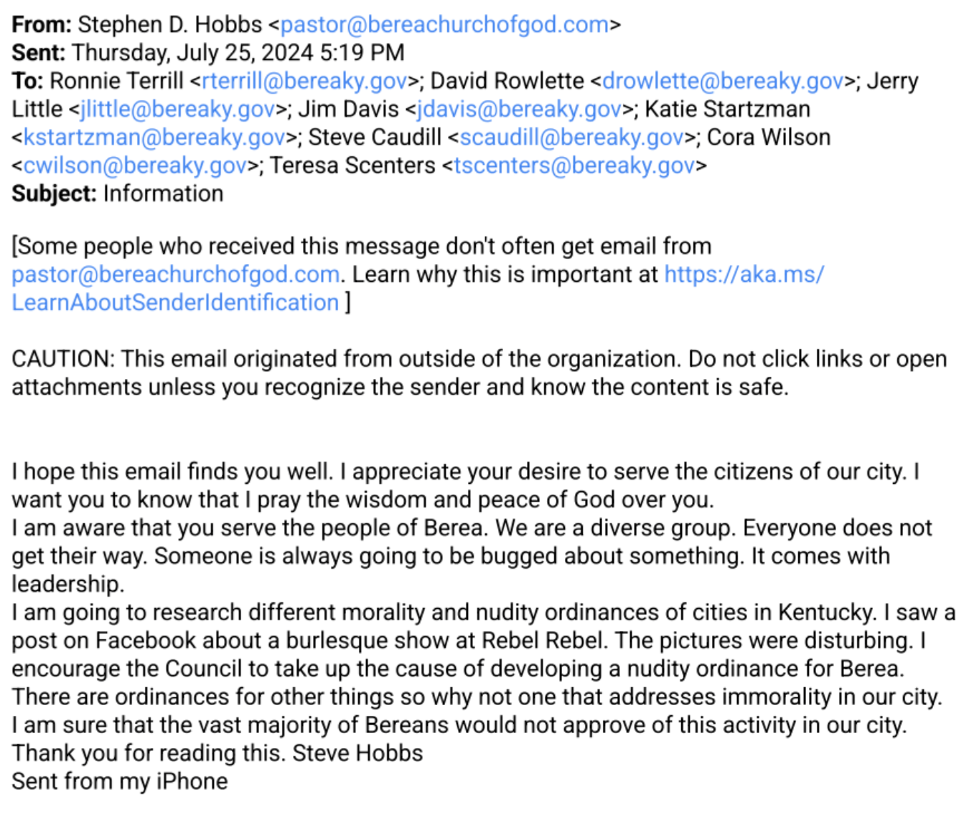 Second, the specific steps his email “encourages” Council to take to preserve morality in Berea are exactly the steps Council is attempting to take.