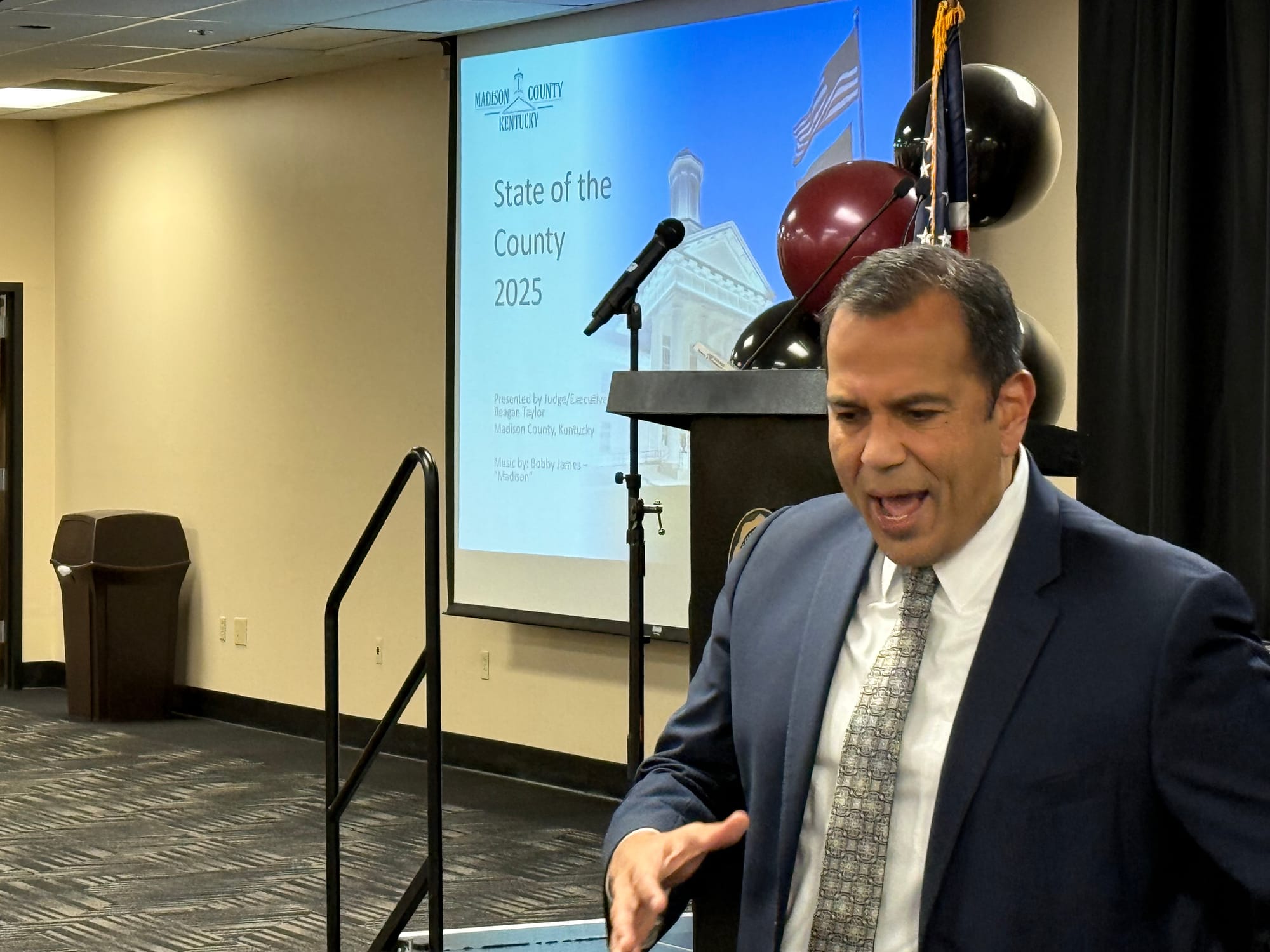Such were the declarations of Madison County Judge Executive Reagan Taylor in his State of the County address, which was about a half-hour long, and given today to a sold out lunch crowd of various County business owners and employees, executives, elected officials, and two Republican hopefuls, in the Perkins Building of EKU. The event was sponsored and hosted by the Richmond Chamber of Commerce.