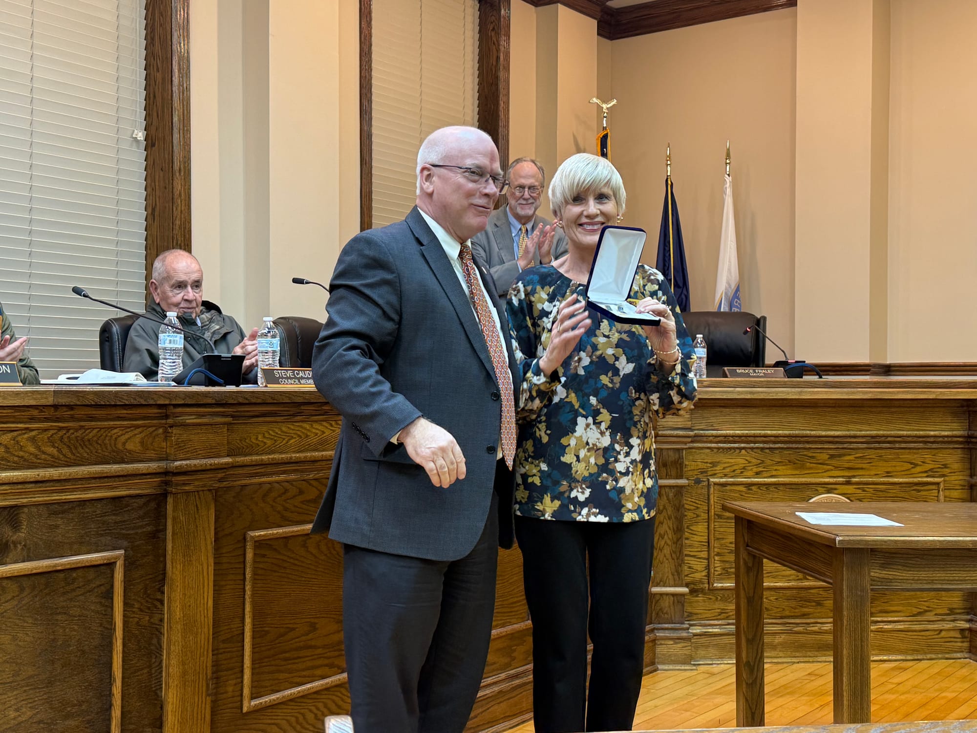 In fact, earlier in the meeting, where public comment would have been, had there been any public to comment, Fraley claimed "executive privilege" and awarded his life-long friend, Lesha Hays, her 30 year pin as a realtor in the state of Kentucky. Fraley said Hays was truly of Berea, because she requested to come to City Hall to celebrate her achievement than go where there was formal attire in a ballroom.